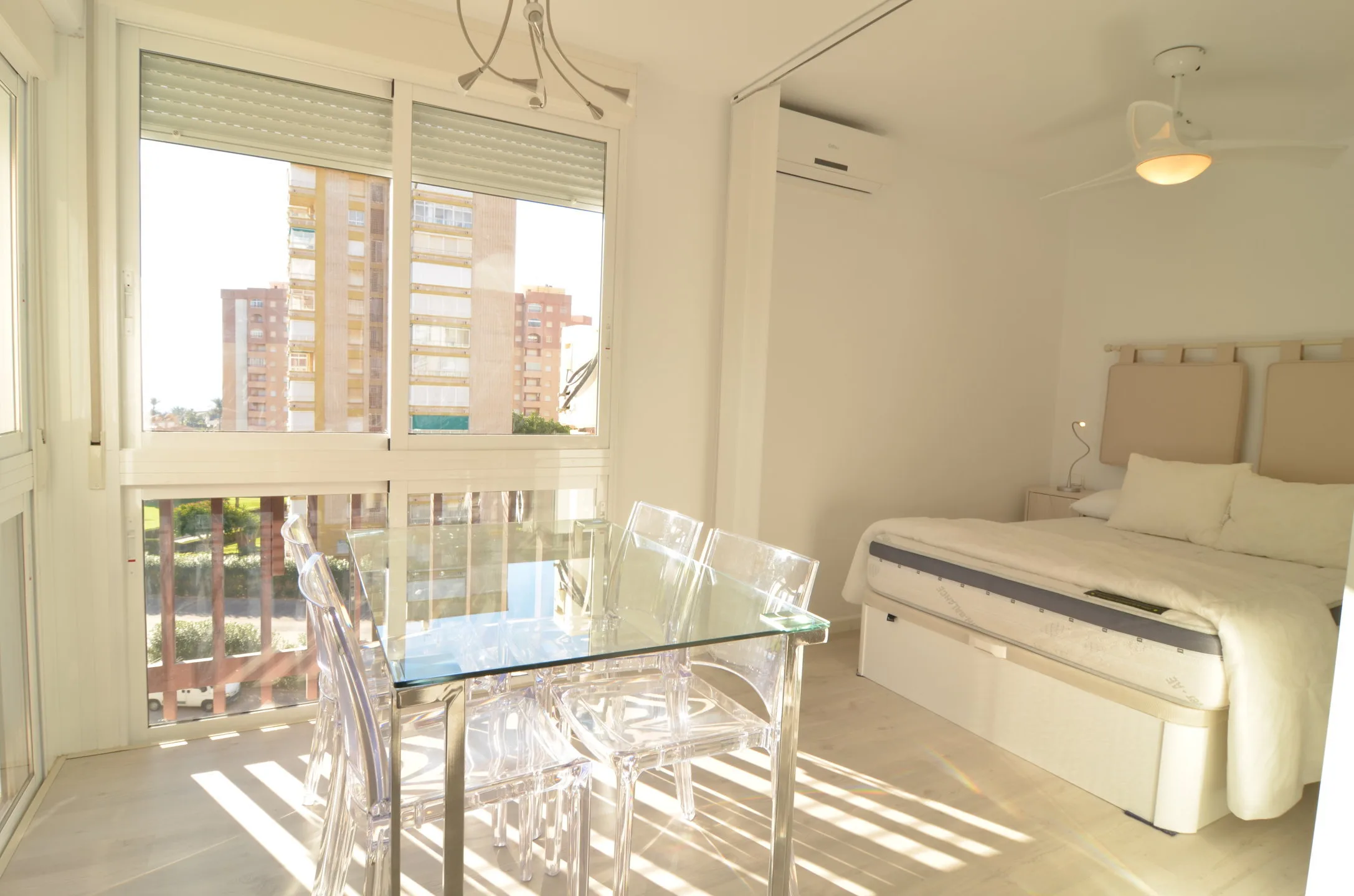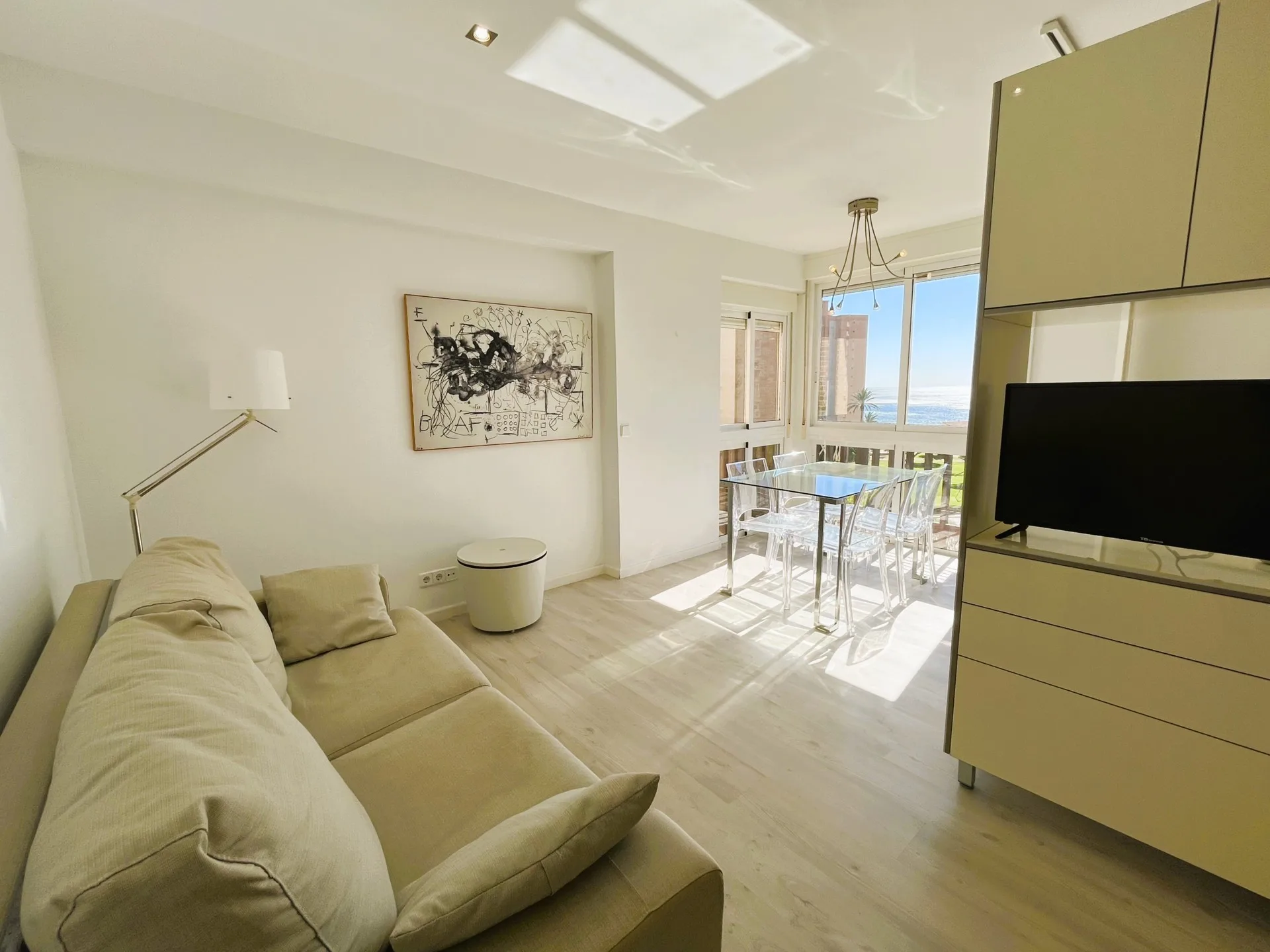 Precioso estudio con vistas al mar en el centro de Campoamor. La vivienda, completamente reformada, consta de una amplia zona de salón- comedor donde han incorporado la terraza original en la vivienda. El salón comparte el espacio con la cocina abierta. Además, la vivienda consta con 1 baño completo y 1 dormitorio de matrimonio, tiene aire acondicionado y ventilador de techo. El edificio cuenta con servicio de portería todo el año. Se encuentra cerca de todos los servicios, bares, restaurantes, supermercado y las mejores playas de la zona..